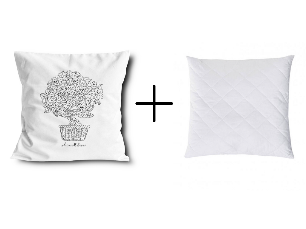 Bílý povlak na polštář ozdobený reprodukcí mé perokresby s motivem elegantní bonsaje.
