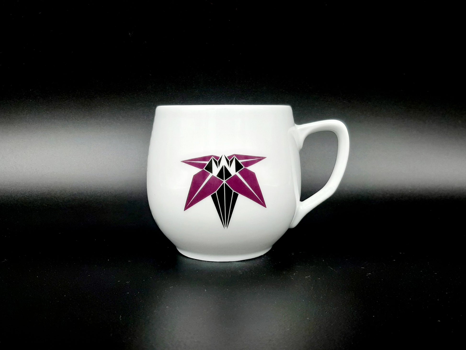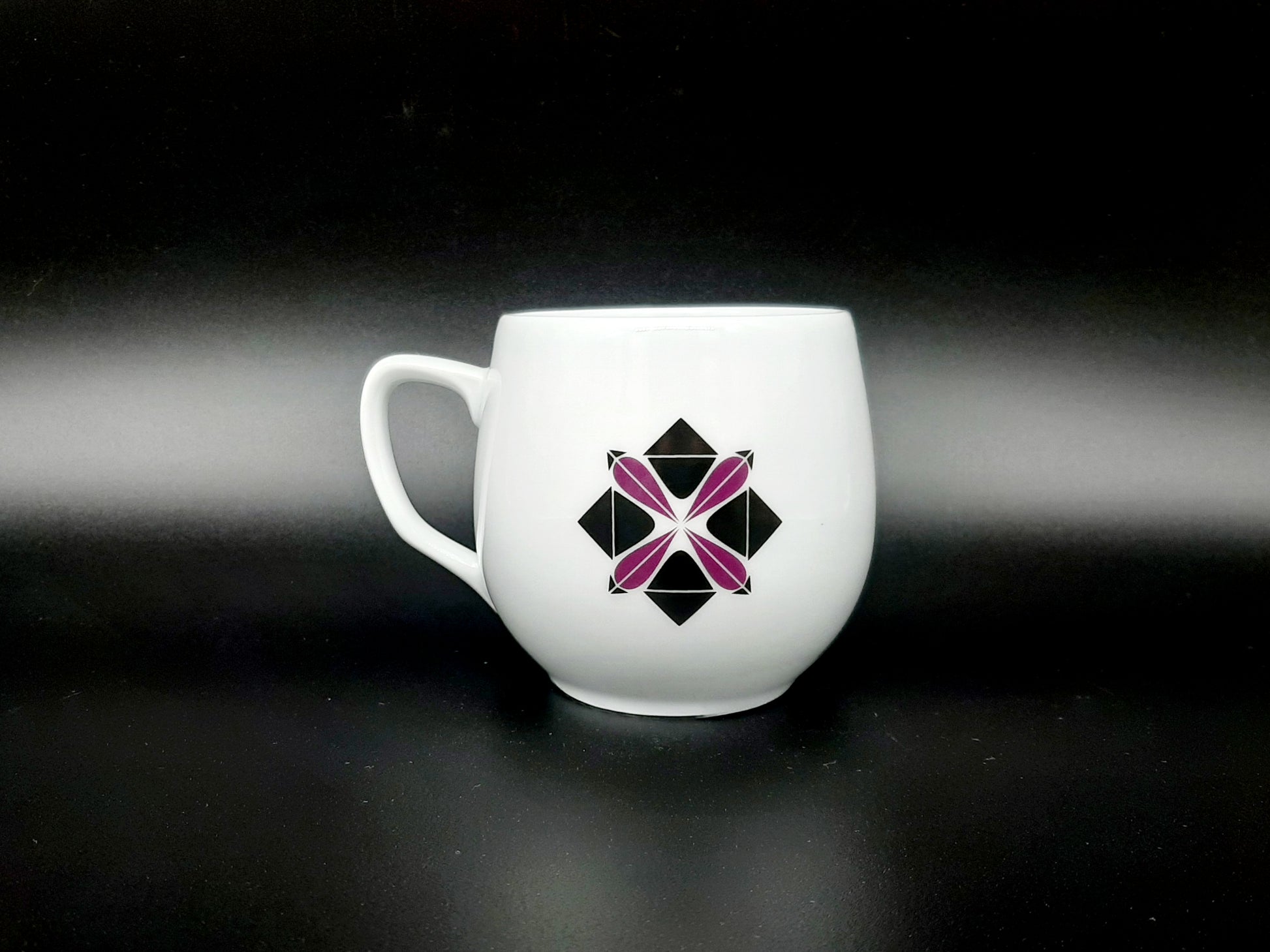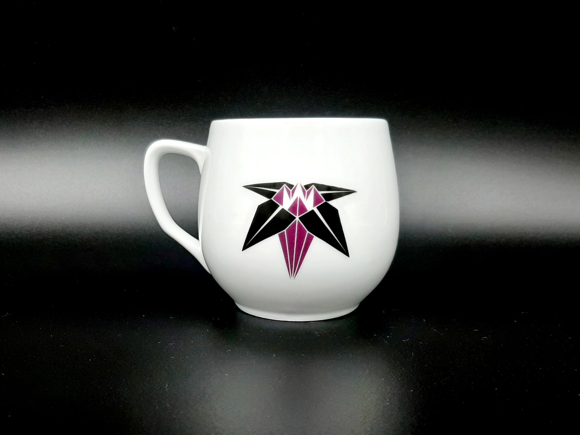 - porcelánový hrnek ozdobený dvoubarevnou origami skládankou skaury, kosatce, javora a lotosu