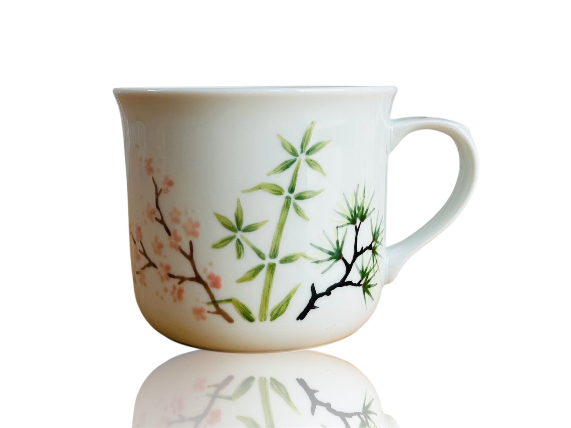 - Porcelánový hrnek ozdobený ruční malbou bambusu, borovice a slivoně