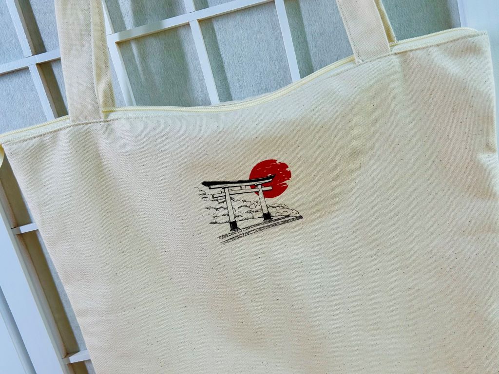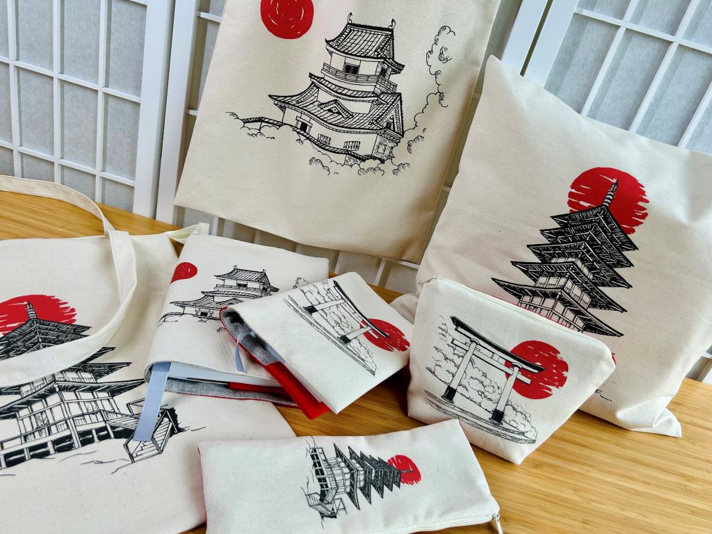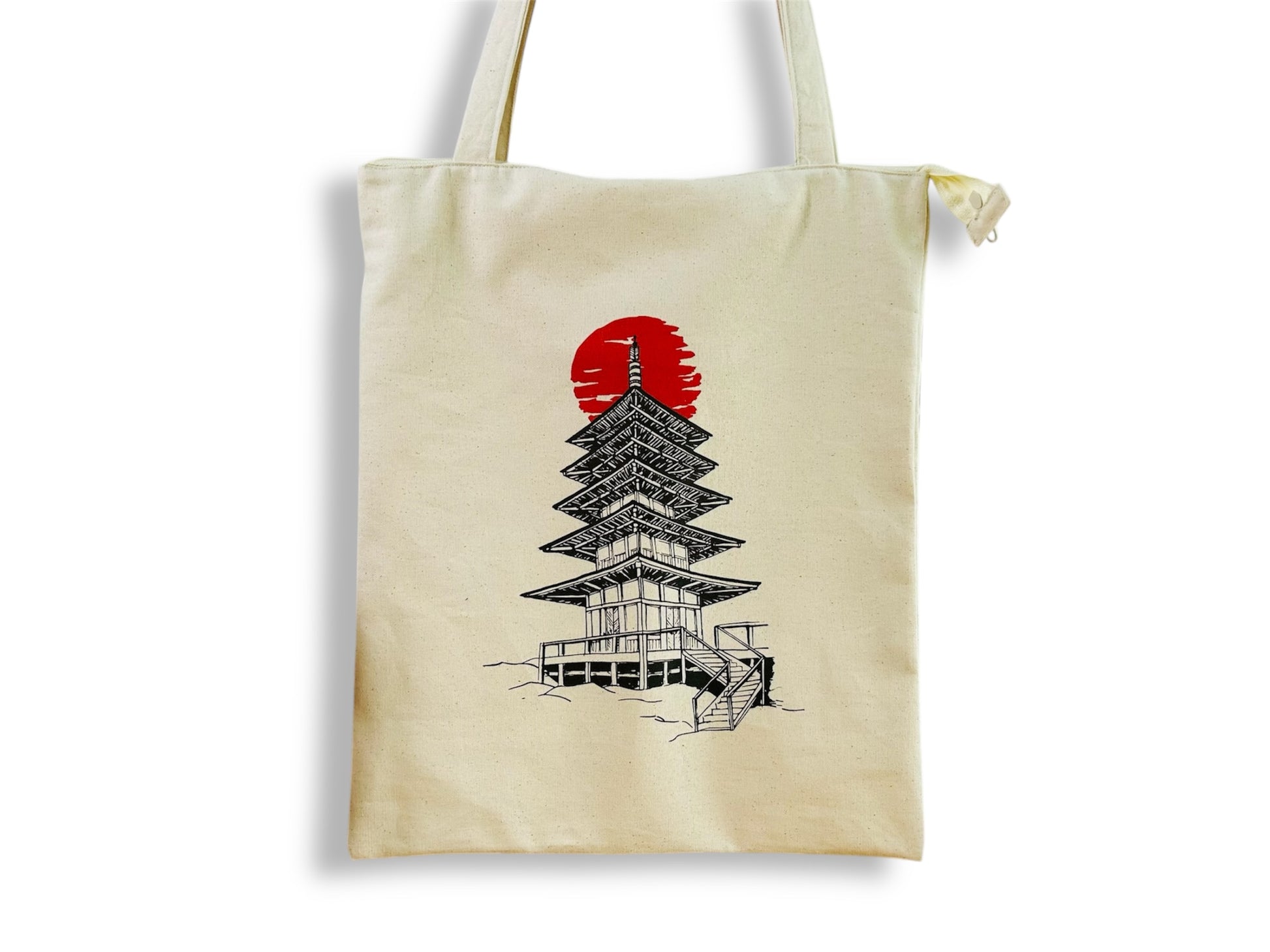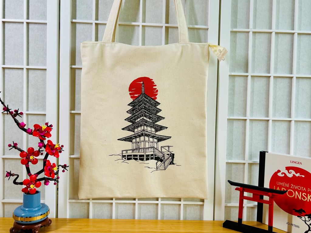 - praktická nákupní taška ozdobená reprodukcí mé perokresby a akrylové malby pagody s červeným sluncem