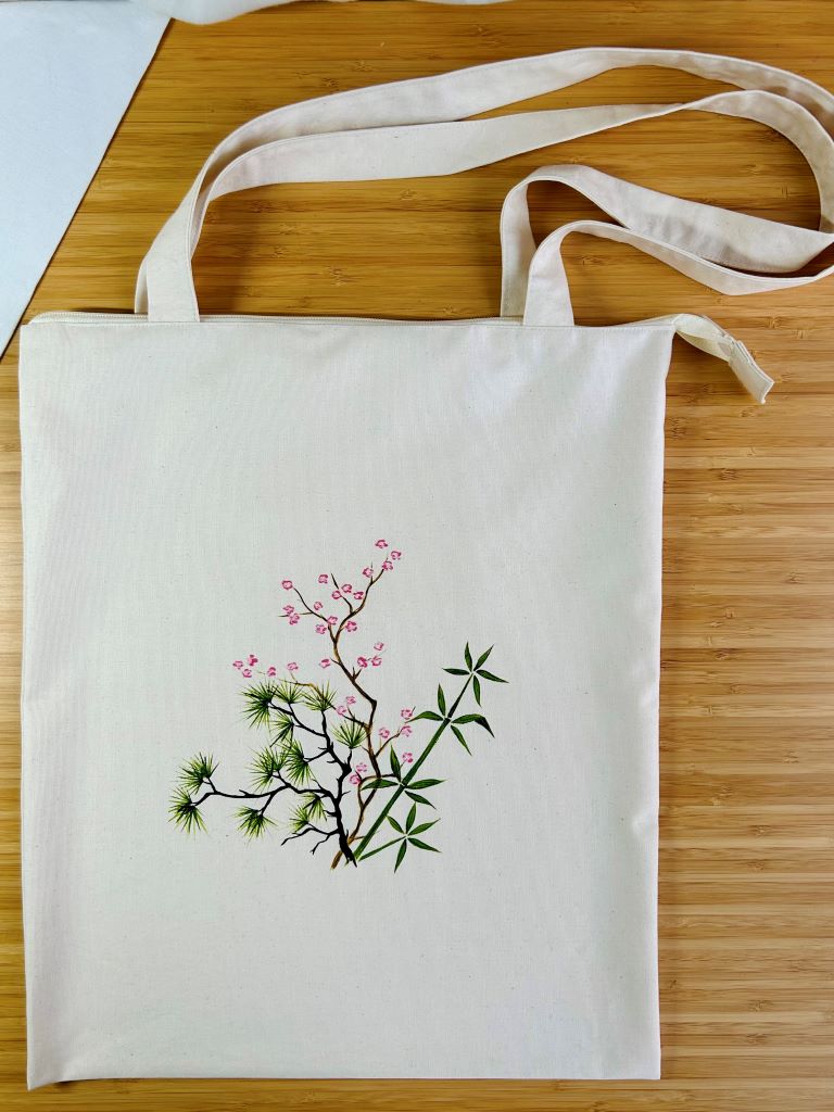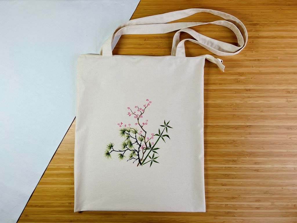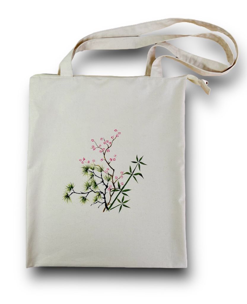 Praktická nákupní taška se zipem a vnitřní kapsičkou s bambusem, borovicí a slivoní nebo-li Třemi přáteli zimy