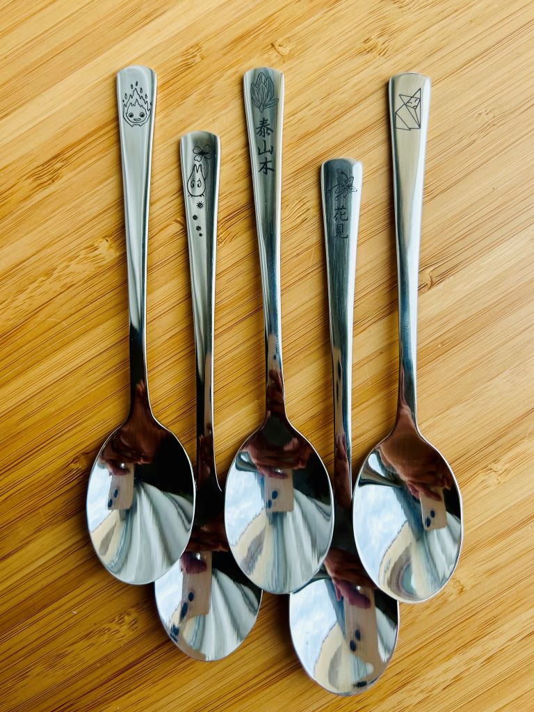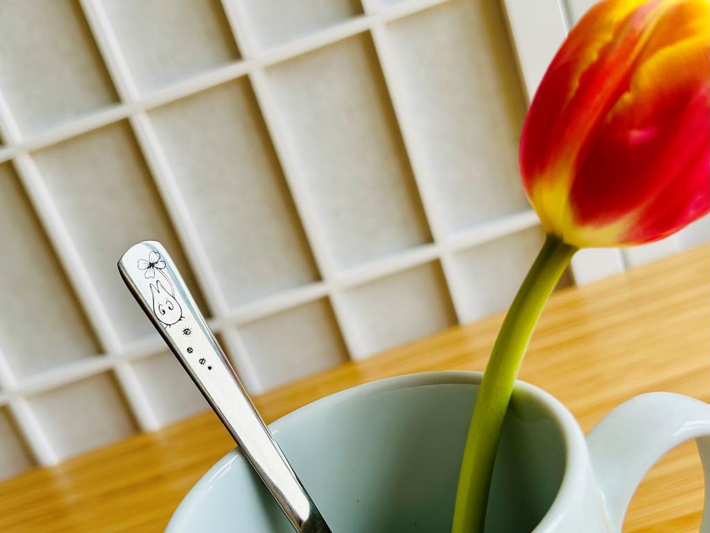 - Nerezová lžička ozdobená gravírováním mé perokresby lesního ducha Totora
