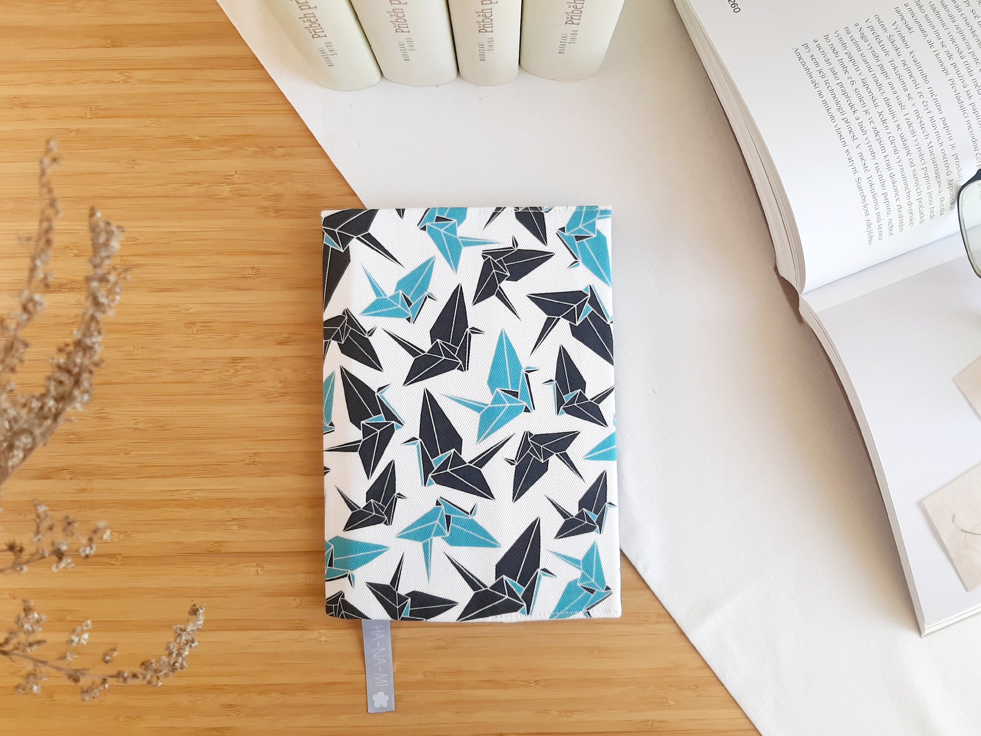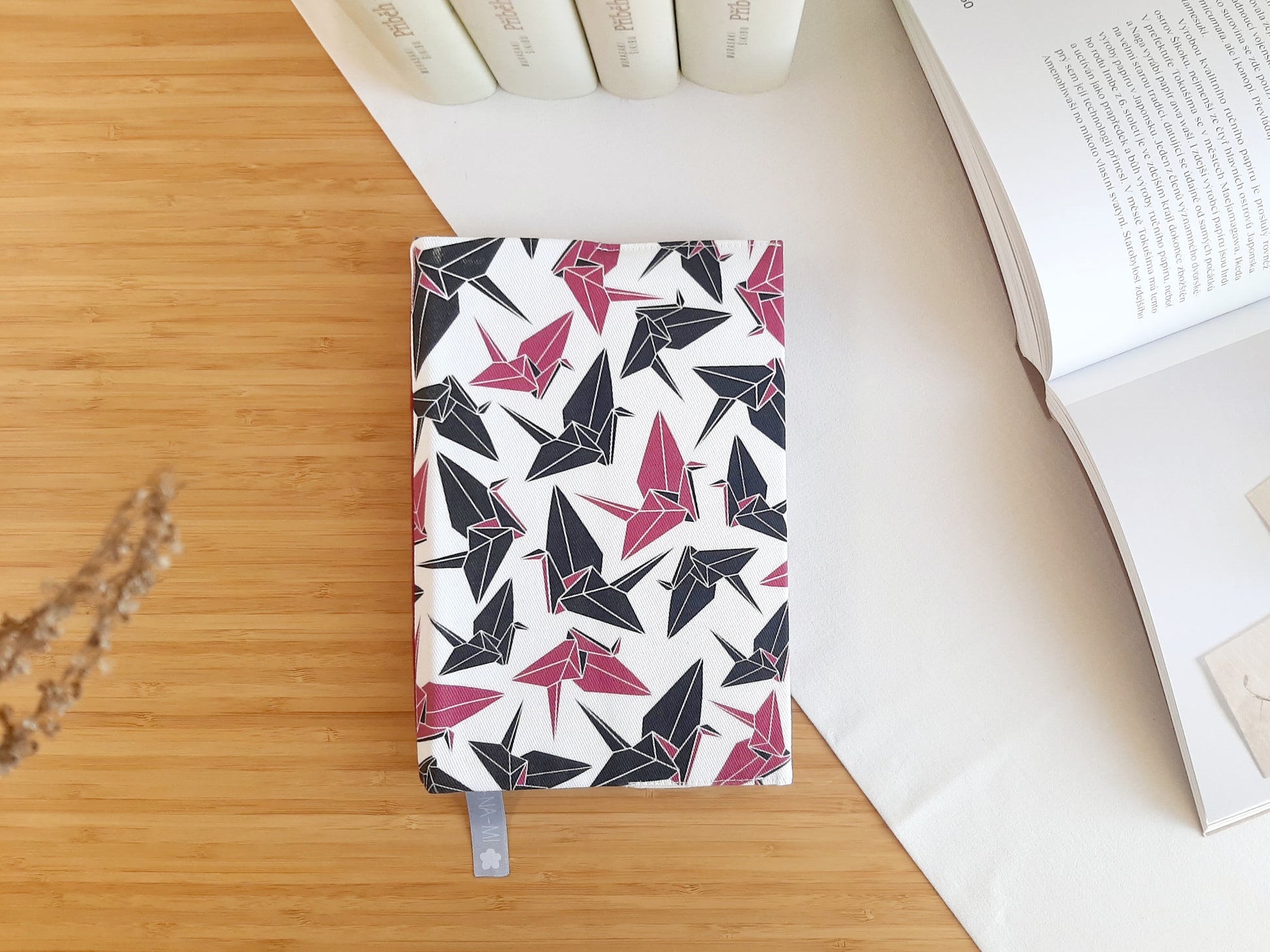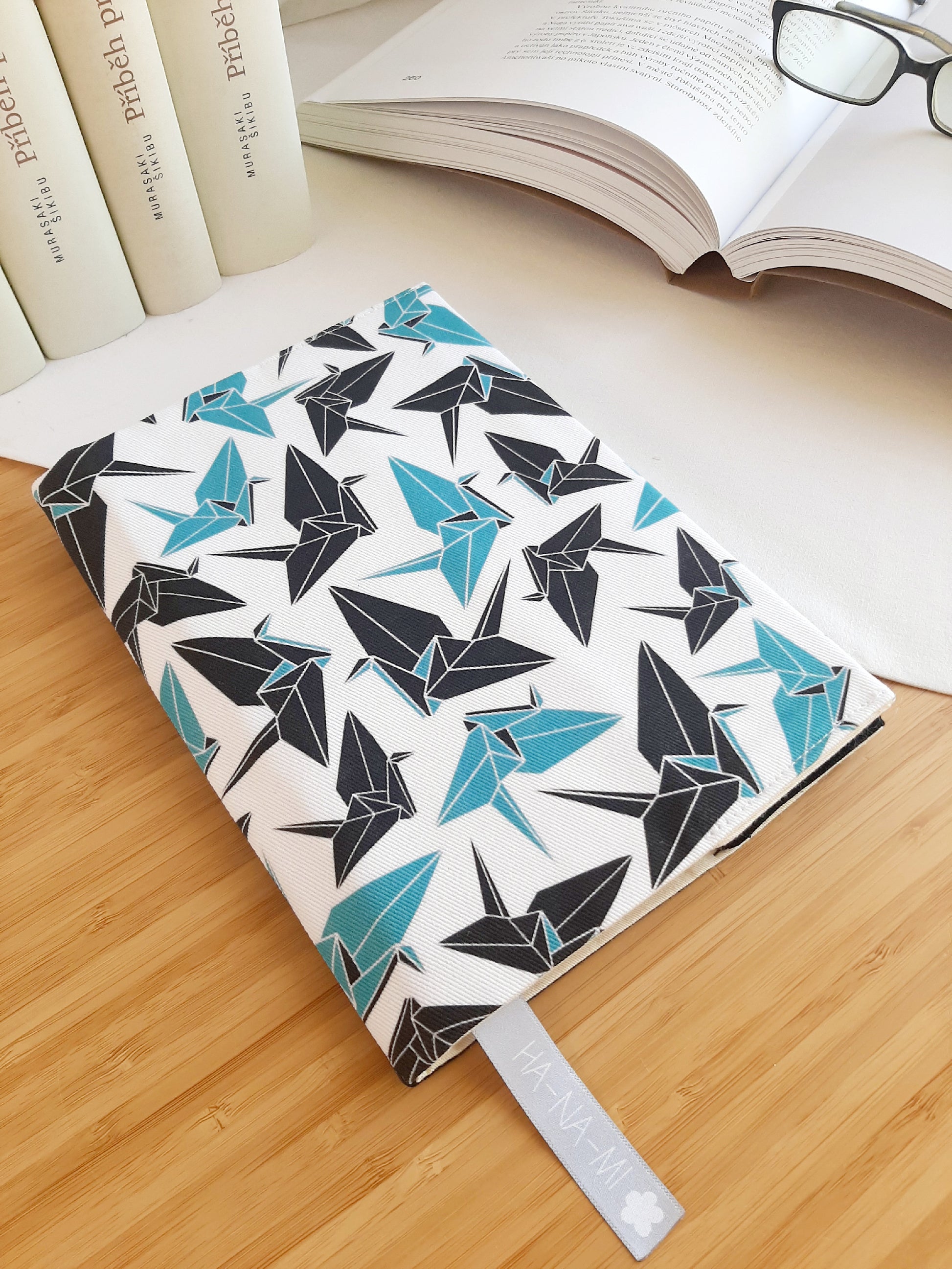 - praktický malý textilní obal na knihu ozdobený dvoubarevnou origami skládankou jeřába