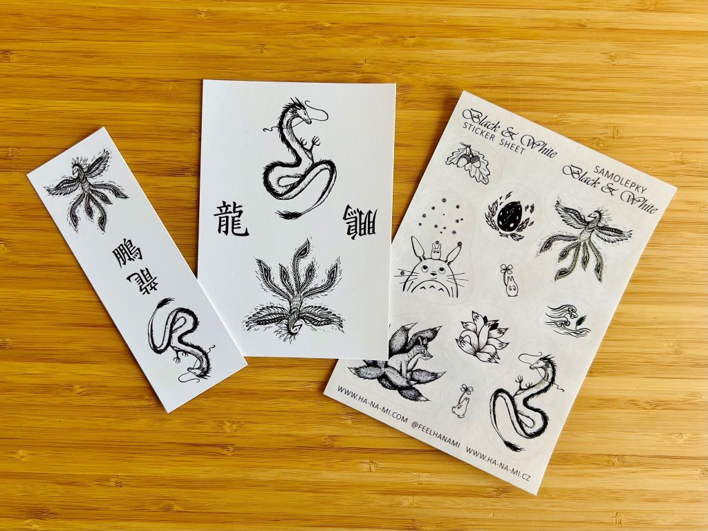- pohlednice ozdobená reprodukcí mých perokreseb draka a fénixe
