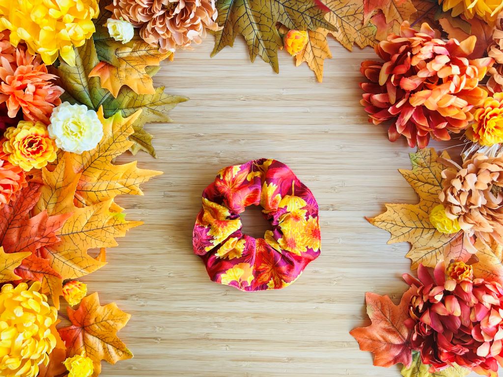 - elegantní scrunchies látková gumička ozdobená reprodukcí mých akrylových maleb chryzantém, javorových listů, listů stromu ginkgo a pavoučí lilie